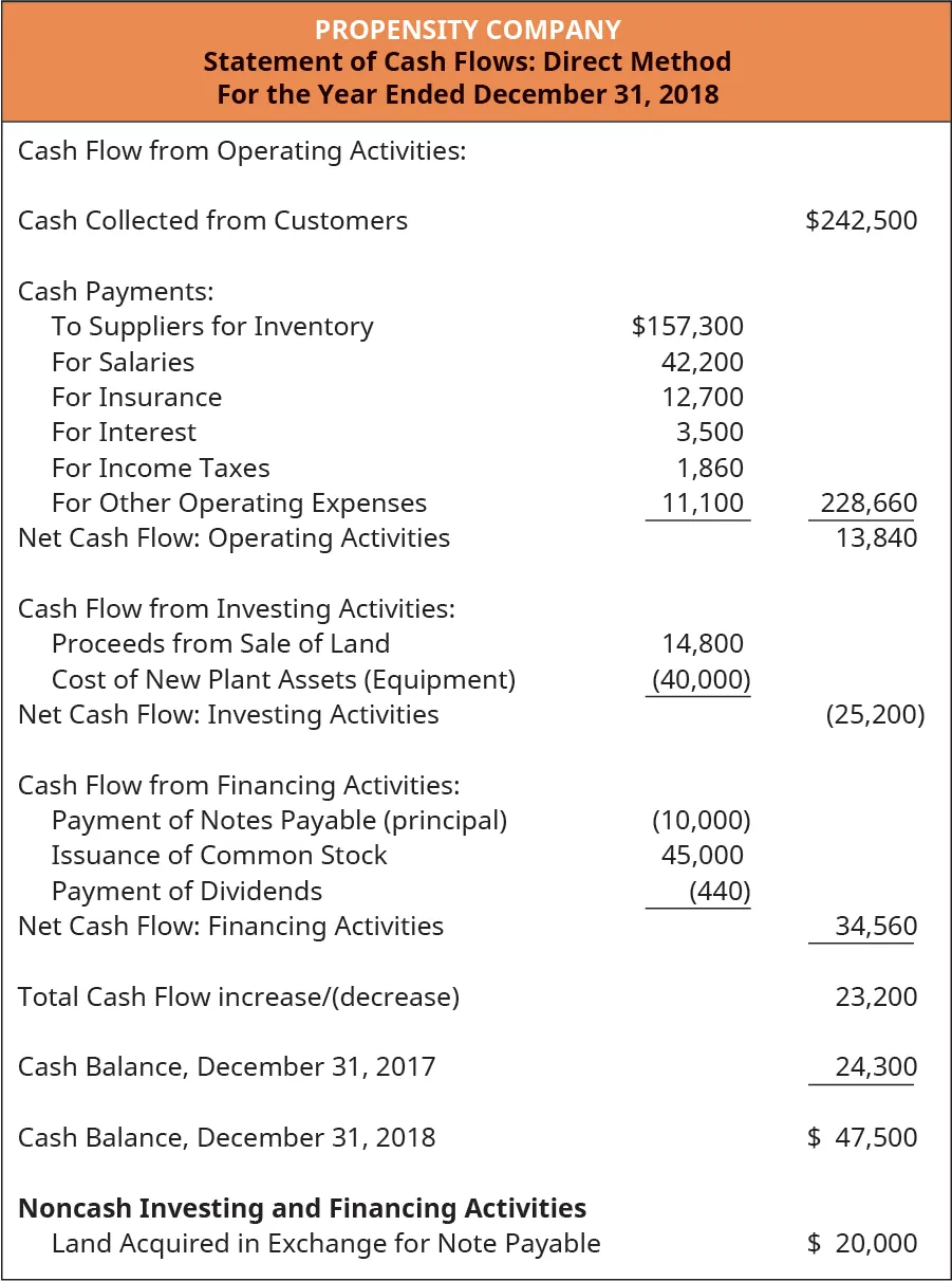 As previously mentioned, the net cash flows for all sections of the statement of cash flows are identical when using the direct method or the indirect method. The difference is just in the way that net cash flows from operating activities are calculated and presented. The direct approach requires that each item of income and expense be converted from the accrual basis value to the cash basis value for that item. This is accomplished by adjusting the accrual amount for the revenue or expense by any related current operating asset or liability. Revenue and expense items that are not related to those current asset and liability accounts would not need an adjustment.